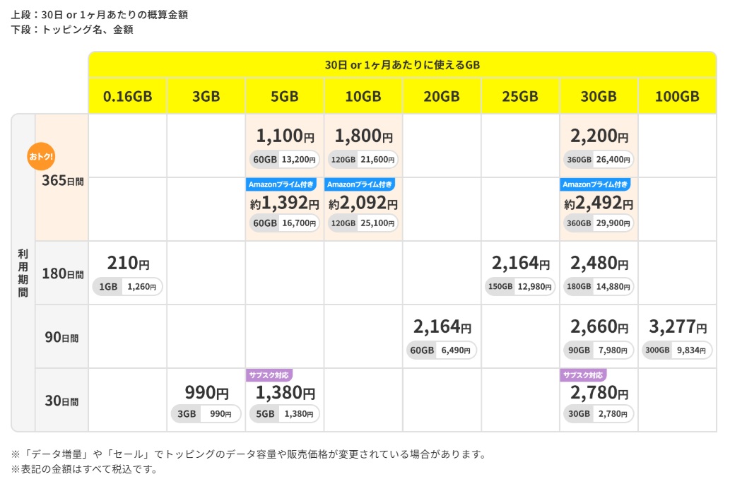 トッピングはデータ容量やデータの有効期間によって料金が定められているよ!