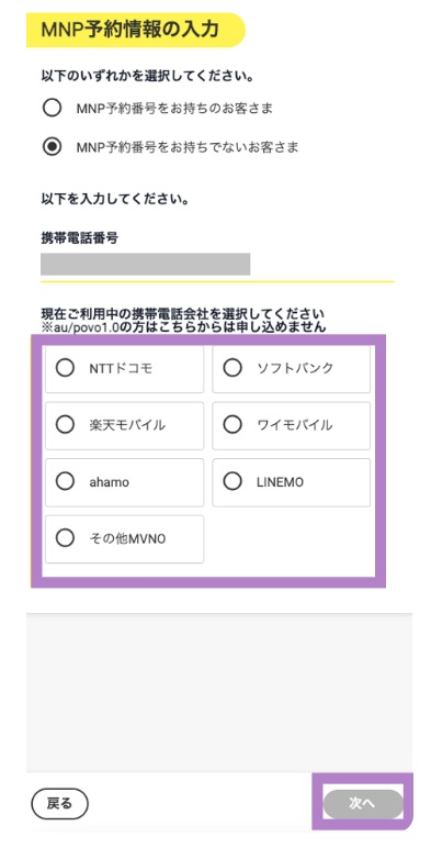 MNPワンストップを利用する場合は、「MNP予約番号をお持ちでないお客様」を選択し、携帯電話番号と契約中のキャリアをクリックします。