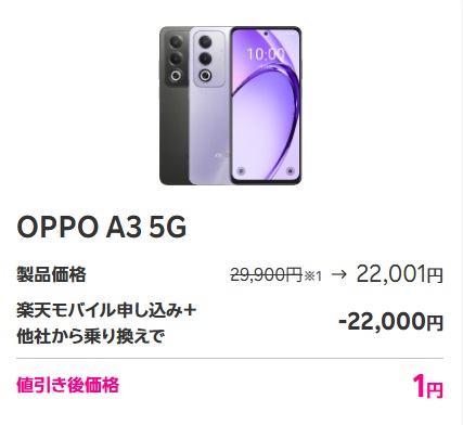 OPPO A3 5Gの通常販売価格は29,900円ですが現在22,001円に値下げしており、さらに楽天モバイルのプラン申し込み&乗り換えで「【Android対象製品限定】特価キャンペーン」が適用されて1円になります。