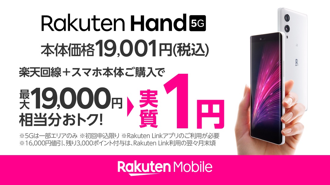 「Rakuten最強プラン」の申し込みと対象機種の同時購入で19,001円の端末代金から19,000円が値引きされ、Rakuten Hand 5Gが1円で購入できる仕組みでした。