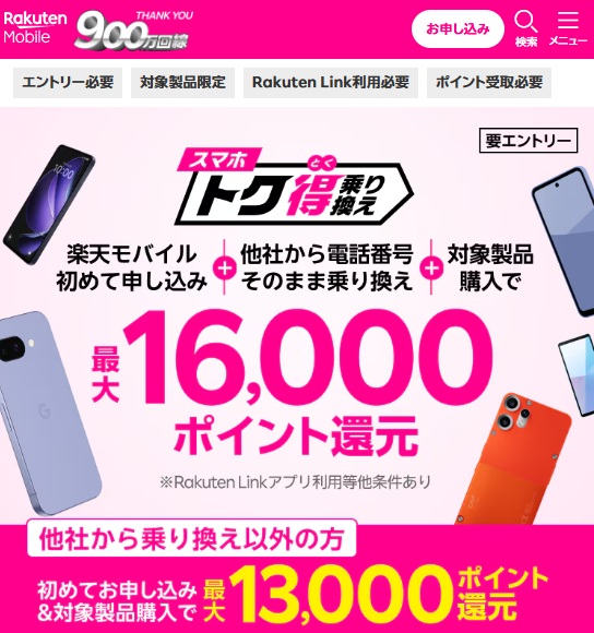 楽天モバイルでは複数のキャンペーンを同時展開しており、たとえば「1円スマホ」とは別に楽天会長の三木谷氏が主導する特別ポイント還元キャンペーンも実施中です。