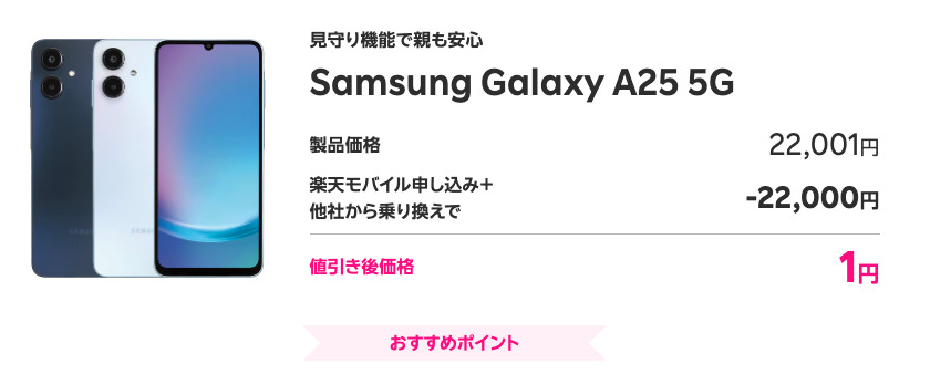 2025年2月発売のSamsung Galaxy A25 5Gも1円で購入できる対象機種です。