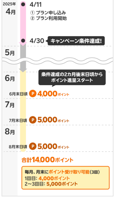| 特典内容 | 乗り換え:14,000円相当のポイント還元(2025年4月11日~) 新規・プラン変更:11,000円相当のポイント還元(2025年9月1日~) |