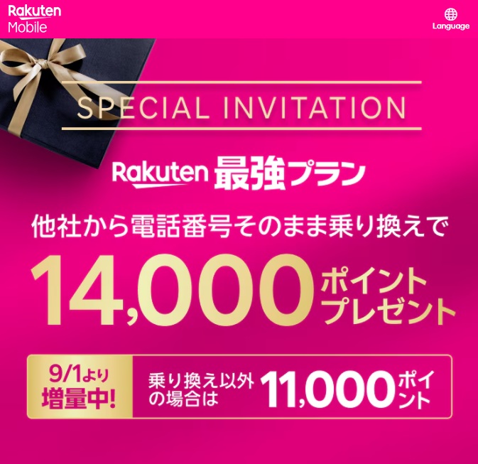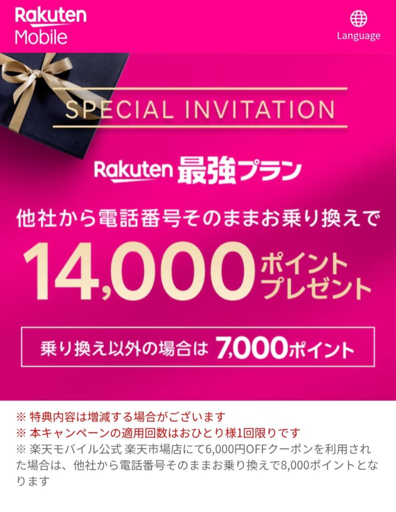 三木谷キャンペーンでは、他社からの乗り換え(MNP)で最大14,000ポイント、新規契約でも11,000ポイントが還元されます。