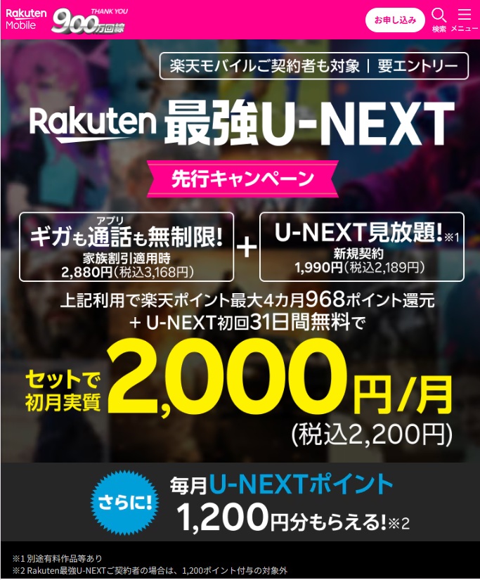 - 2025年11月1日~ 三木谷キャンペーンの対象プランに「Rakuten最強U-NEXT」が追加、クーポンコードが「WTPRMI20251001」に変更になりました。