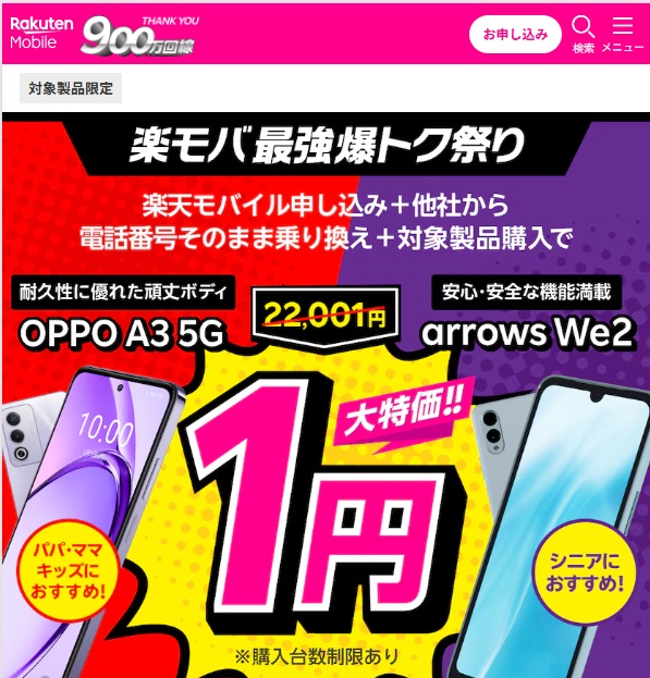 楽天モバイルの公式サイトから直接三木谷キャンペーンの専用ページにはリンクされていないため、三木谷社長本人のSNSアカウントや本記事のボタンなどから申し込むのがおすすめです。