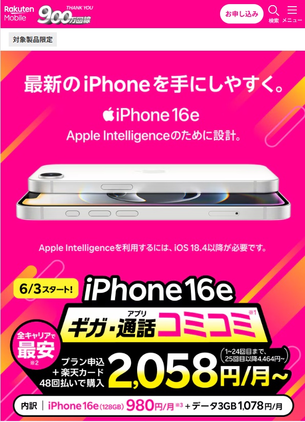 | ⑮超おトク!「Rakuten最強プラン契約&iPhone買い替え超トクプログラム利用」特価キャンペーン (2938) | iPhone 16e (128GB)が 実質24円 | × | × | ― | ◎ | × | × |