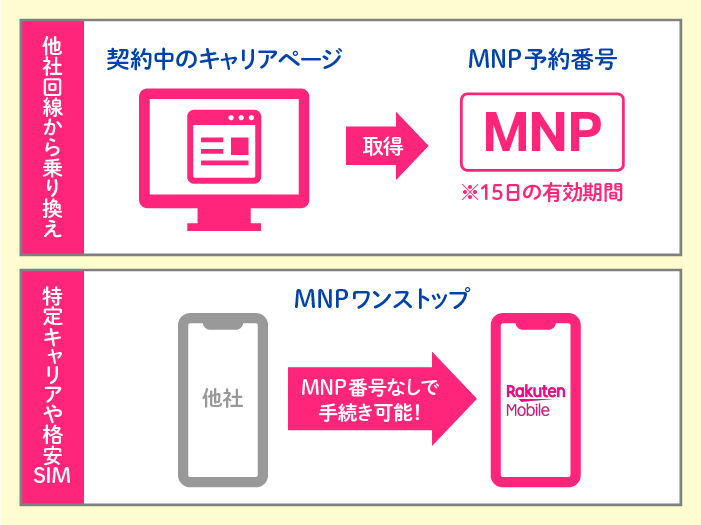 乗り換えとは、他社スマホ会社から同じ電話番号を使って楽天モバイルを契約する「MNP乗り換え」を意味します。