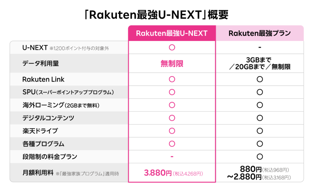 | 比較項目 | Rakuten最強プラン | Rakuten最強U-NEXT |
