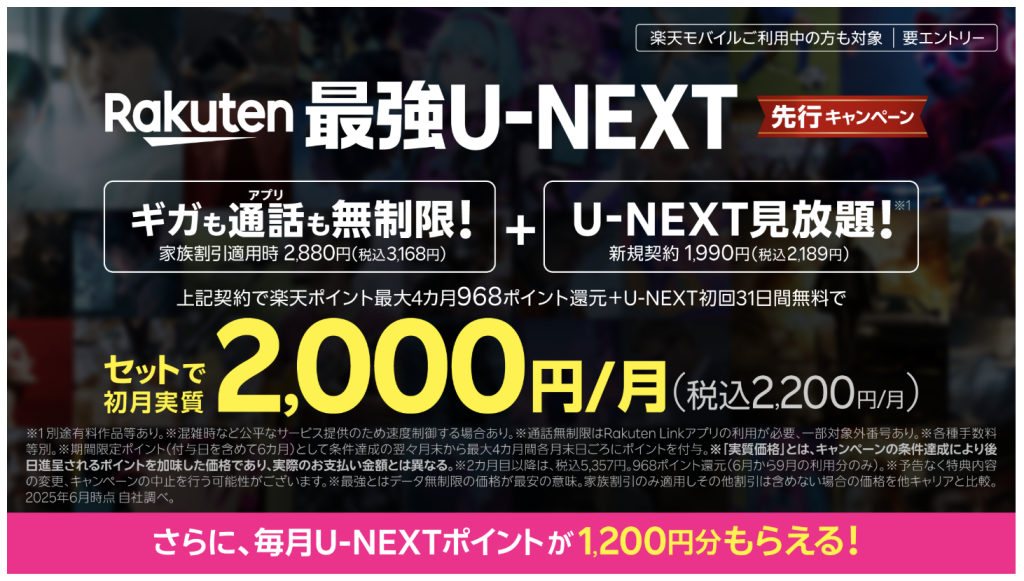 Rakuten最強U-NEXTは、正式提供に先立ち、2025年6月23日から9月30日までの期間限定で「先行キャンペーン」を実施中です。このキャンペーンを活用すれば、初月の実質価格を2,000円台に抑えられるほか、最大3,872ポイント(968pt×4カ月)の還元を受け取ることができます。