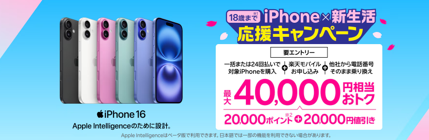 2026年4月現在、楽天モバイルでは、18歳までの方であればiPhone 16が最大40,000円おトクになるキャンペーンを開催中です。