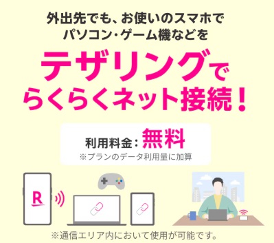 楽天モバイルのテザリングは無料で使えます。