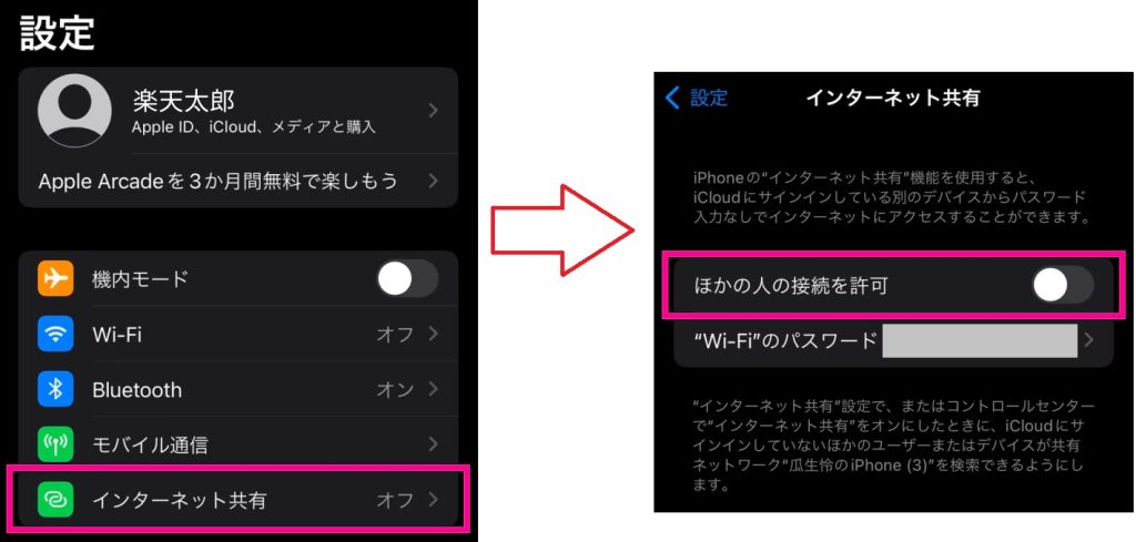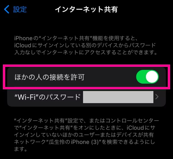[インターネット共有]をタップし、[ほかの人の接続を許可]をオンにする
