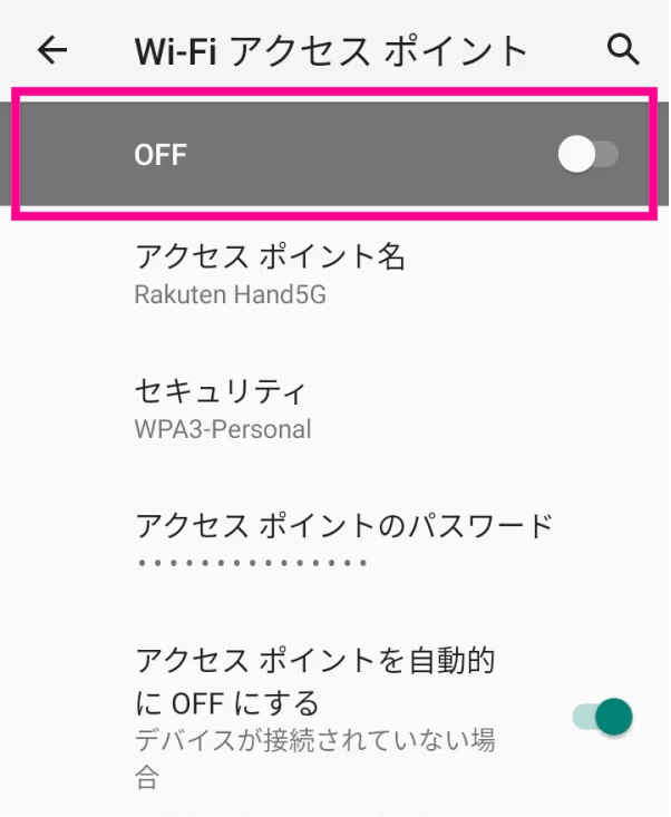 Wi-Fiテザリングは設定をオンにしている間は、他の人の機器にも自分のスマホのアクセスポイントが表示されます。