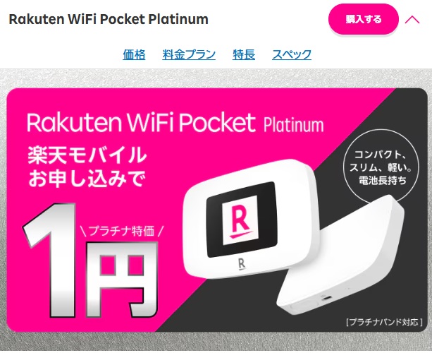 Rakuten WiFi Pocket Platinumでは現在、キャンペーンで通常10,820円の端末代金が一括1円になります。