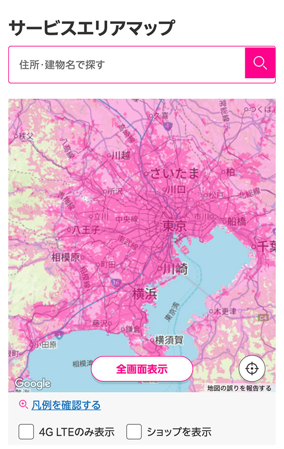 各回線の対応エリアは楽天モバイル公式サイトから確認でき、検索欄にお住まいの住所または郵便番号を入力すると、濃いピンク色が「楽天回線エリア」、薄いピンク色が「パートナー回線エリア」で表示されるので、チェックしてみてください。
