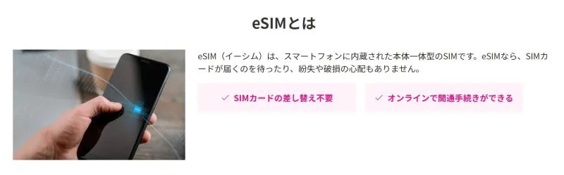 物理SIMですと小さいSIMカードなので差し替えにも苦労しますが、eSIMであればSIMを差し替える煩わしさもありません。