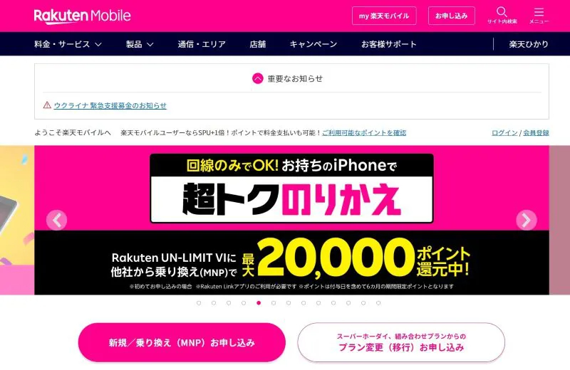 まずは楽天モバイルの公式ページから、新規もしくは乗り換えで手続きに進んでください。