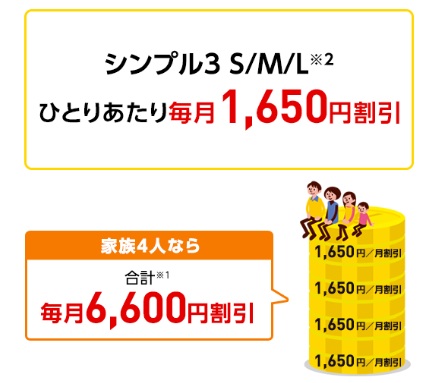 ソフトバンクと比べると若干割引額は低下しますが、2回線目から1,100円の割引になるメリットがあります。