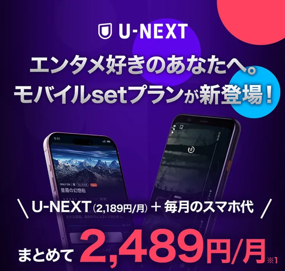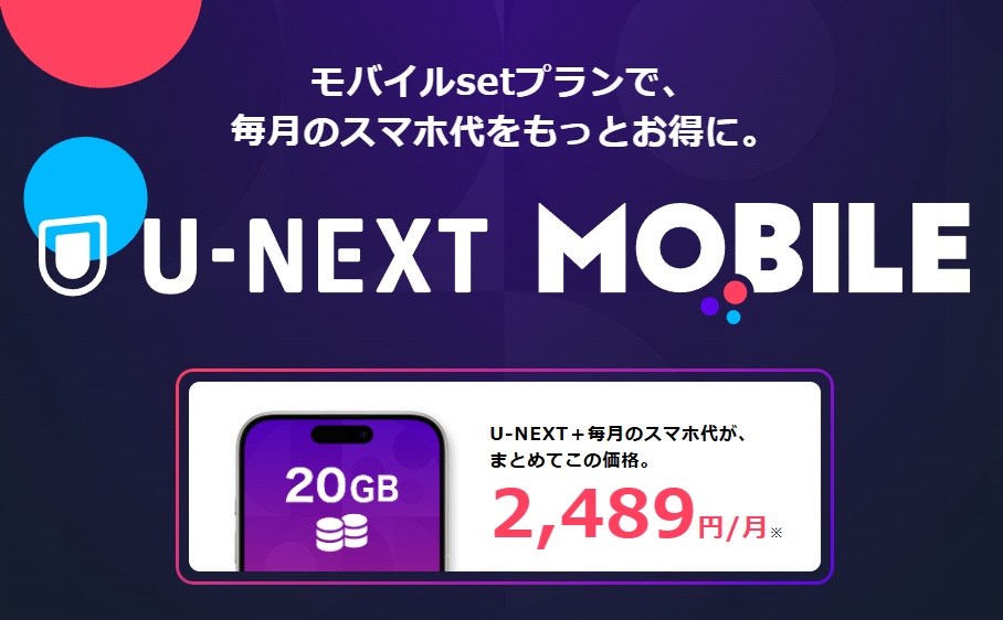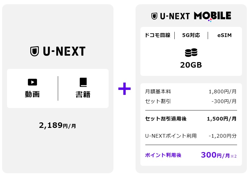 月額2,189円のU-NEXTとあわせても、スマホ代込みで毎月のコストは2,489円~となる。