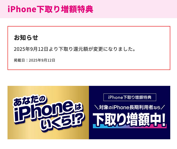 例えばiPhoneの場合、2025年9月時点の割引額は以下の通りです。