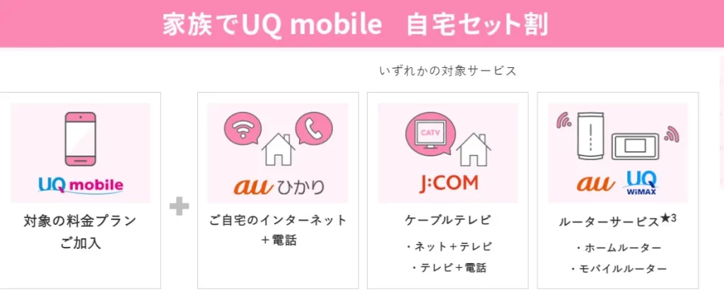 たとえば家族セット割や自宅セット割、UQ mobile SIMデビューキャンペーンやスペシャルクーポンは併用できませんが、3Gとりかえ割(UQ mobile)は、3Gとりかえ割プラス(UQ mobile)と併用できます。
