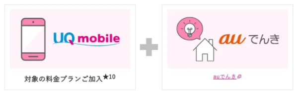 自宅セット割 でんきコース」はUQモバイルとauでんきをセットで利用することで、スマホの月額料金から毎月最大1,100円の割引が適用できるキャンペーンです。