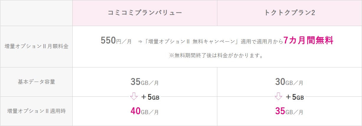 ※2 月額550円/『増量オプションⅡ無料キャンペーン』で適用月から最大7ヵ月間無料。キャンペーン終了後は、自動的にオプション料発生。