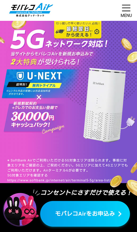 | 開通工事が不要 5G対応でモバイル回線でも快適 最新端末が実質無料 スマホとのセット割あり |