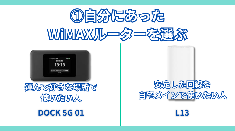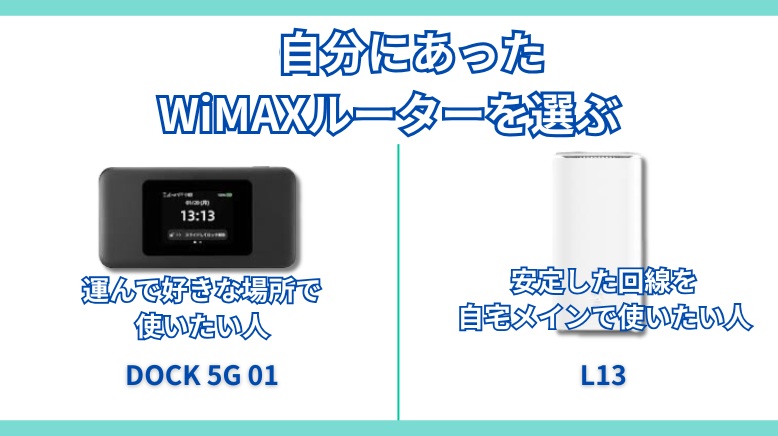 WiMAXの各プロバイダでは現在、最新機種としてポケット型WiFiなら「Speed Wi-Fi DOCK 5G 01」、ホームルーターなら「Speed Wi-Fi HOME 5G L13」を販売しています。