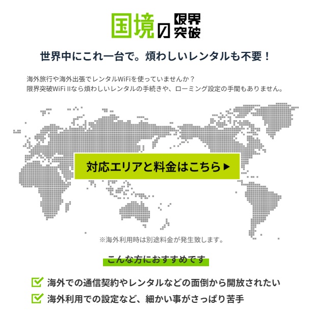 また、旧プランでは海外で1日1GB単位で料金を設定していましたが、限界突破WiFi Ⅱではアップデートして1日無制限で使えるようになりました。