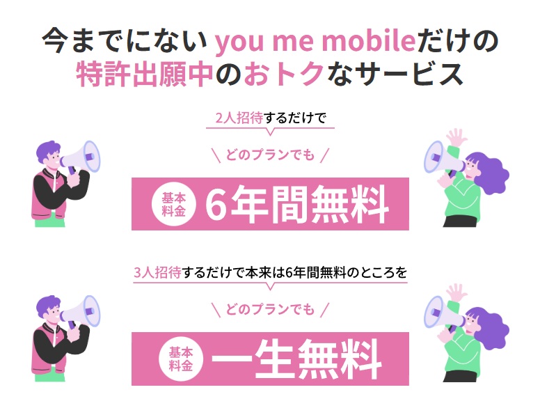 さらに、奥様にyou me mobileを契約してもらえば、招待で3回線契約となり、紹介した方は一生無料で使える仕組みです。