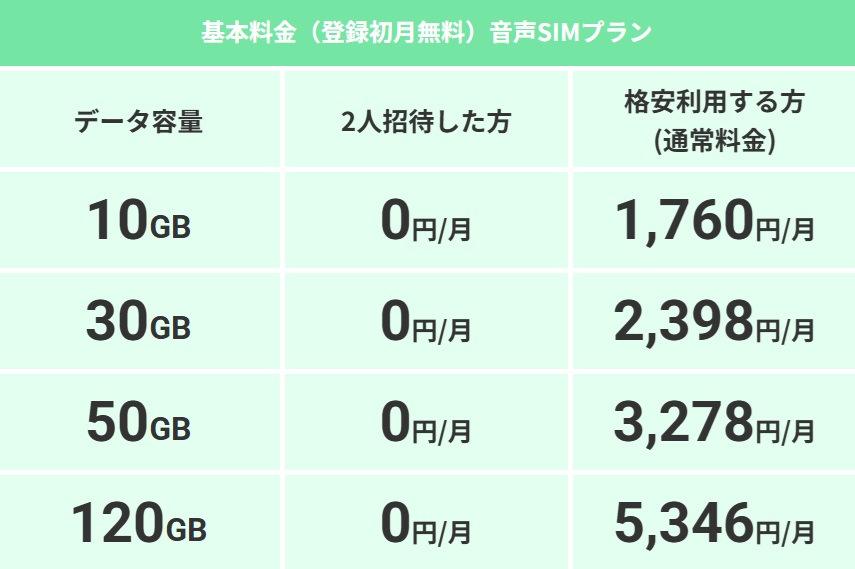 もちろん、120GBの大容量プランでも、紹介制で2人以上契約いただければ無料になります。