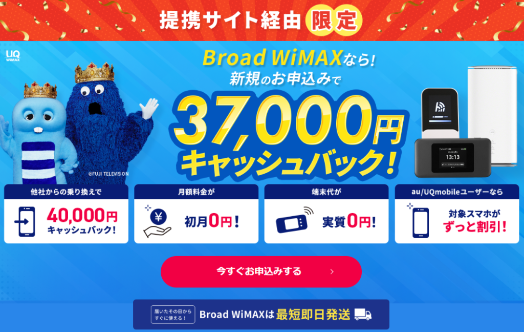 ※各記事内にある「Broad WiMAX 公式サイトはこちら」と記載があるピンクのボタンからお申込みいただくと限定キャンペーンの対象となります。