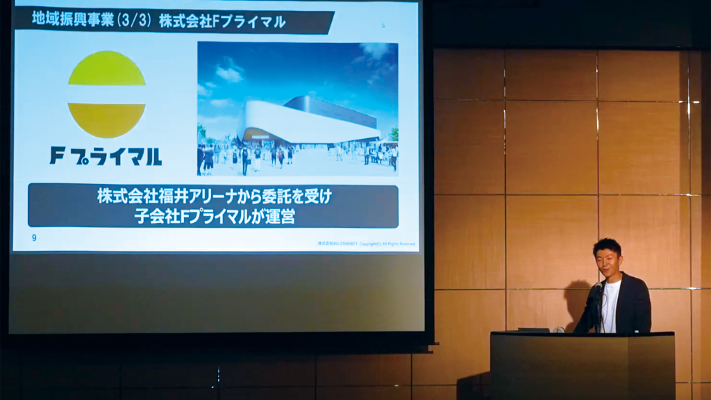プロバスケットボールクラブ「福井BLOWINDS」、子会社オウデムが実行委員会を組成し運営する「ワンパークフェスティバル」、そして子会社Fプライマルが運営をしていく「福井アリーナ」など、福井の魅力を高める多様な事業を取り上げながら、それらを単なる社会貢献で終わらせず、“事業”として成立させることで持続的に発展させていく考え方を語りました。
